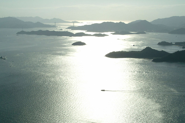 目前には、秋晴れにさざめく瀬戸内海。借景のような島々とうっすらと霞む“しまなみ大橋”が旅情を誘います。