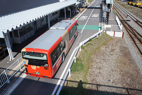 ですが震災により線路は断絶、鉄道が不通に。その後同年の4月には一ノ関駅と気仙沼駅間の運転は再開。気仙沼駅から盛駅間は不通のままで、現在は、元線路だった場所をバス専用道路に変え、2013年の3月2日からBRT(バス高速輸送システム)が運行開始しています。 そのため、見た目は電車の発着駅所にも見えますが、中の待合室を通過し、駅フォームに立つと、目の前がコンクリートで舗装されたバス専用道路であることが分かります。また、奥の線路は、貨物専用です。