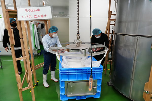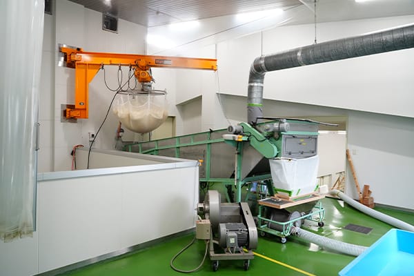 こだわったのは、一つが洗米から蒸米までの原料処理を徹底したいということ。そのための設備を整え、少ない人数でも対応できるよう動線も工夫しました。画期的だったのは、1階で蒸したお米をクレーンで持ち上げ、2階の放冷機に移動させるシステムです。蒸し器の中の米をスコップで掘って人力で何度も運ぶよりもはるかに手間が省け、人手も少なくて済みます。