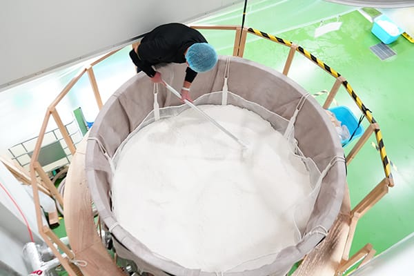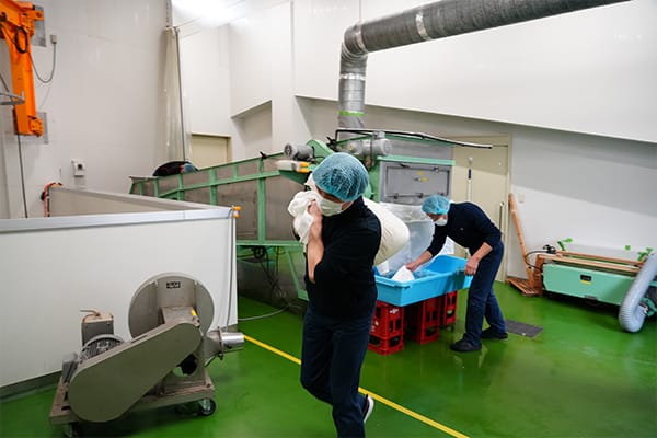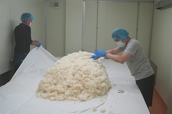 クレーンで持ち上げた蒸米は放冷機に移しますが、このとき使うのは、大小のしゃもじ。しゃもじを使う蔵は初めて見たので尋ねてみると、「最初は手袋をして手でやっていたんですが、蒸したばかりの米は熱いし、手袋は穴が開きやすい。それで、作業しながらみんなで話しているうちに、『給食センターなどで使っている大きなしゃもじがいいんじゃない?』という話に。使ってみたら使い勝手がよくて、大小そろえて使い分けています」と、スタッフ同士で、より作業効率のよい方法を模索し実践。自由に意見を出し合える風通しのよい蔵の雰囲気が伝わるエピソードです。