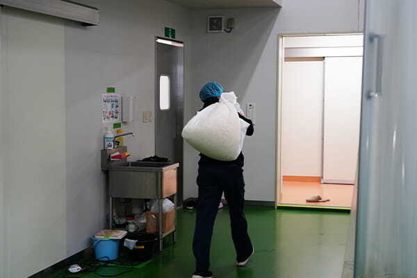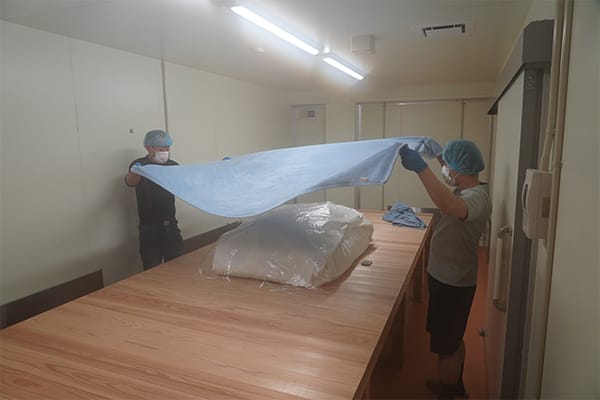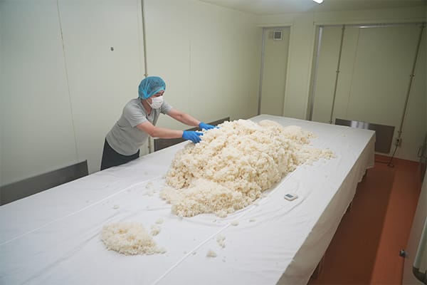 小林さんが新蔵でもう一つこだわったのが、麹室です。「以前の麹室は、湿度や温度管理が難しかったので、管理しやすい室が希望でした。そのため、いろいろな蔵へ見学に行って皆さんの意見をうかがいました」。その結果、3室とそこを行き来するための前室付きの麹室を完成させたのです。3つの室の壁は開閉式で、麹作りのために引き込んだ蒸し米を、横の部屋にスライドさせながら湿度と温度の管理をすることができ、効率よく質のよい麹作りができるようになりました。